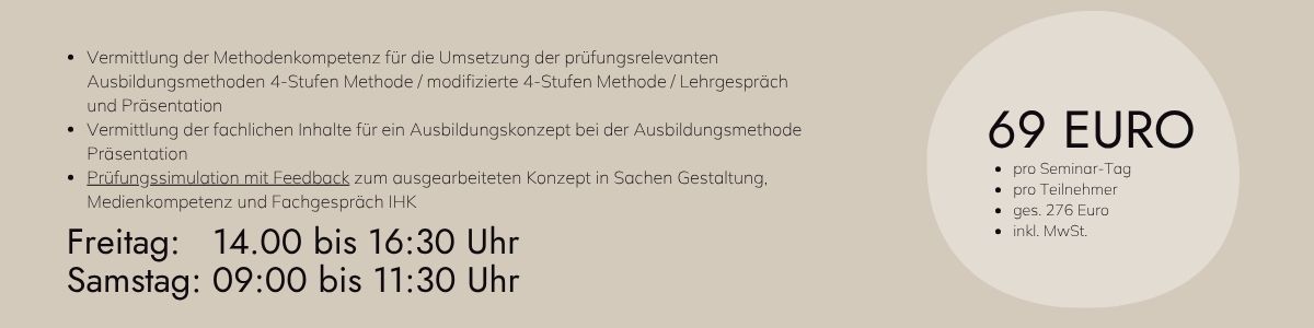 Hierzu erhalten Sie von uns die Möglichkeit, in einer Prüfungssimulation vor der Prüfung Ihr Konzept zu präsentieren und erhalten ein inhaltliches Feedback zur Durchführung der gewählten Ausbildungsmethode sowie zum situationsbezogenen Fachgespräch.